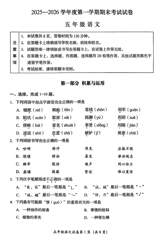 房山区小学五年级2025-2026学年度第一学期末语文试卷