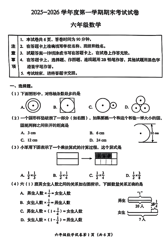 房山区小学六年级2025-2026学年度第一学期末数学试卷