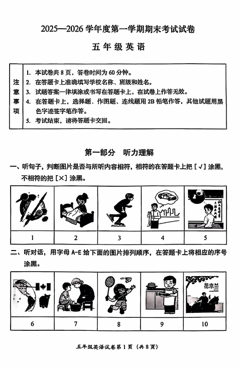 房山区小学五年级2025-2026学年度第一学期末英语试卷