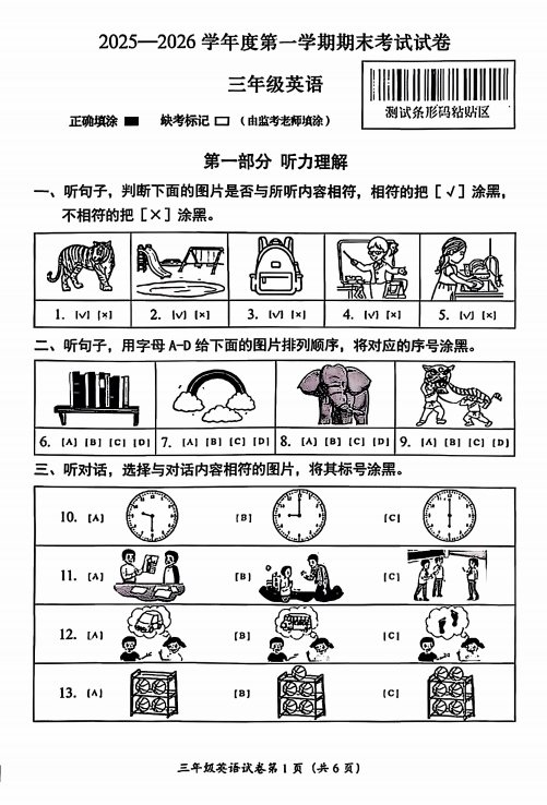 房山区小学三年级2025-2026学年度第一学期末英语试卷