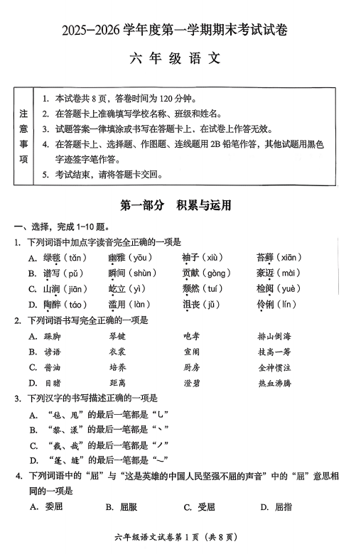 房山区小学六年级2025-2026学年度第一学期末语文试卷
