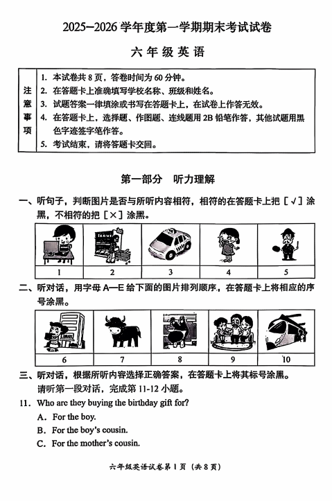 房山区小学六年级2025-2026学年度第一学期末英语试卷