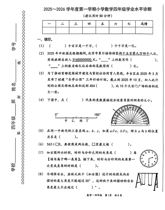 丰台区小学四年级2025-2026学年度第一学期末数学试卷来啦!速来下载!
