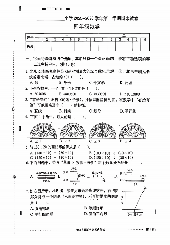 西城区小学四年级2025-2026学年度第一学期末数学试卷正式发布!点击下文可下载打印,同时本文还包含北京市各区往年中小学真题试卷库,家长可关注使用!