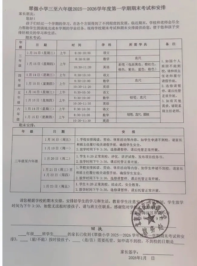 2、2026年北京各中小学期末考试时间、寒假放假、开学返校通知持续更新!家长可收藏本文,方便了解北京小学生动态。