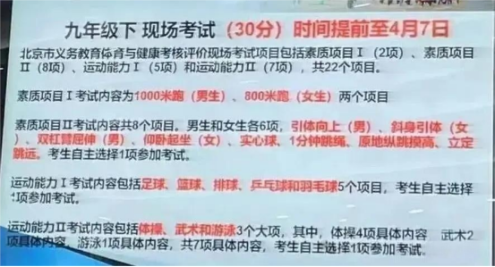 据热心考生分享,某校体育现场考时间已提前至4月7日。相比去年最早考的海淀区提前了2天: