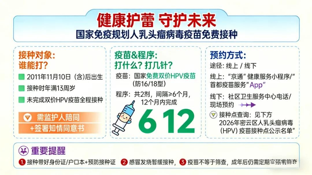 北京市各城区中学年满13岁女生接种HPV疫苗通知持续更新!其中房山区、密云区为13岁女孩送上健康大礼——免费接种HPV疫苗!两区已发布详细接种攻略,涵盖接种时间、地点、流程及注意事项等。家长们请及时关注,为孩子预约接种,共同守护她们的青春健康,筑起免疫防线。