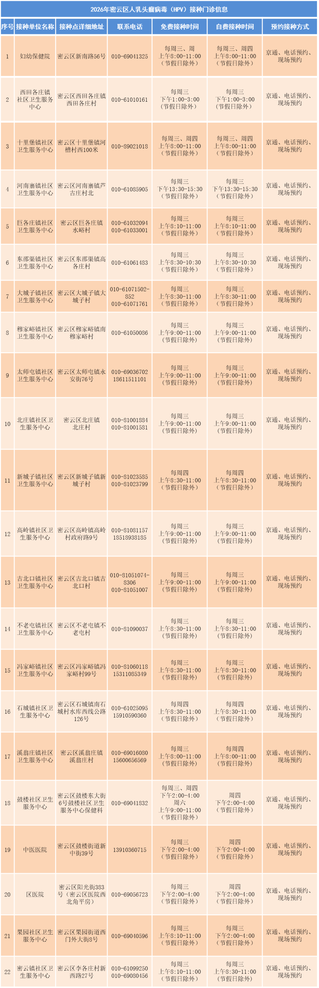 电话/现场预约:拨打居住地所在的社区卫生服务中心预防接种门诊电话进行预约咨询,或前往现场登记。密云区各接种点地址和联系方式可见下图