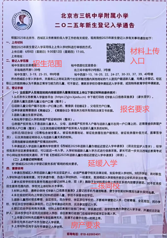 西城区小学报名以线上报名为主,且小学招生简章中有诸多重点关键信息,以2025年西城区三帆中学附属小学招生简章为例: