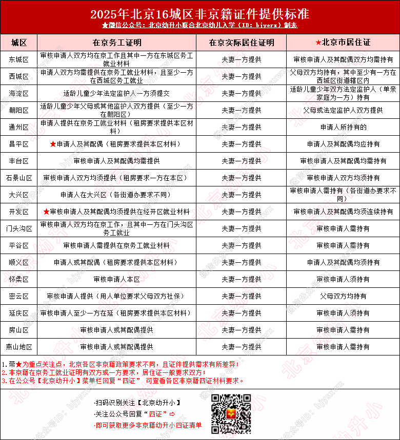 据往年入学请款来看,不同城区对非京籍入学材料要求有所不同,其中,在京实际居住证明,16区均只需父母一方提供!