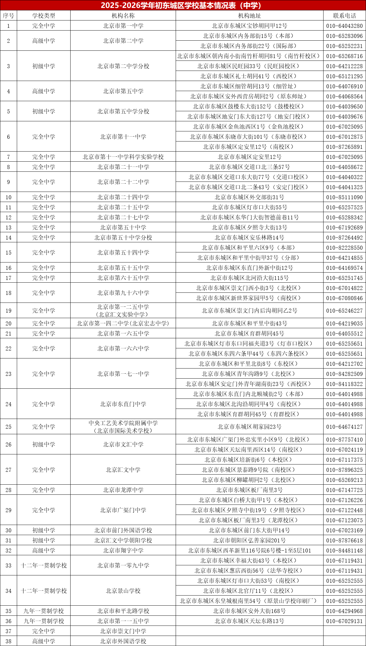 2026年东城区中学名单正式发布!本文整理全区公办完整名录,标注学校地址、联系方式及电话,为东城区家长快速了解东城区内教育资源!