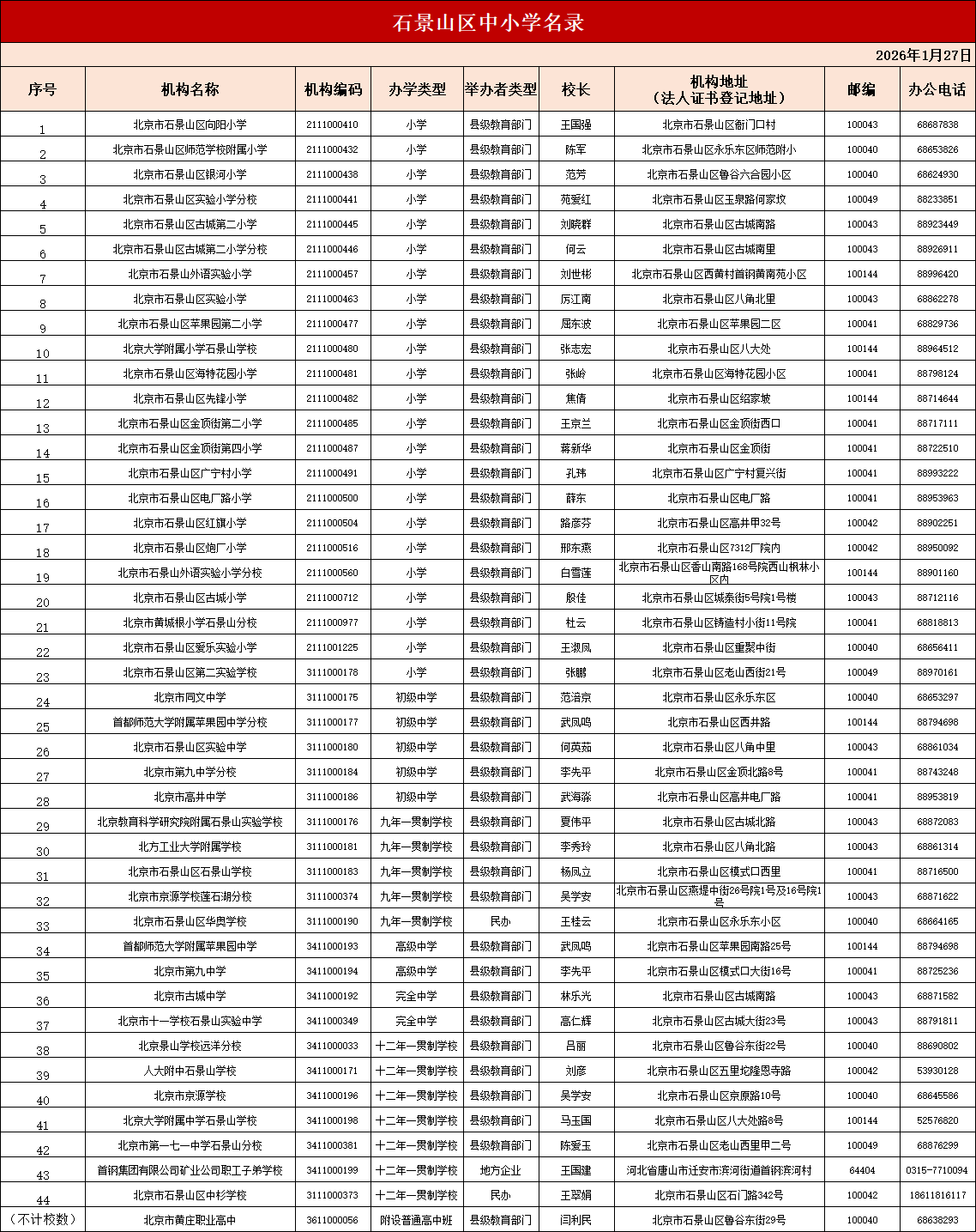 2026年石景山区中小学名录包含各学校名称、编码、办学类型、校长、学校地址、邮编、办公电话等信息: