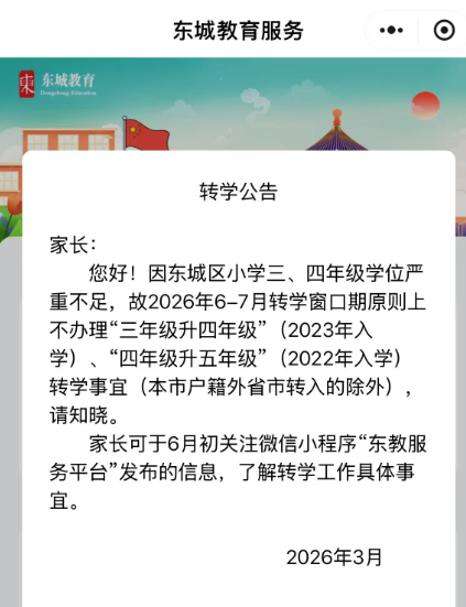 北京幼升小网团队提醒:东城区官方提醒:因东城区小学三、四年级学位严重不足,故2026年6-7月转学窗口期原则上不办理“三年级升四年级”(2023年入学)、“四年级升五年级”(2022年入学)转学事宜(本市户籍外省市转入的除外),请知晓。家长可于6月初关注微信小程序“东教服务平台”发布的信息,了解转学工作具体事宜。