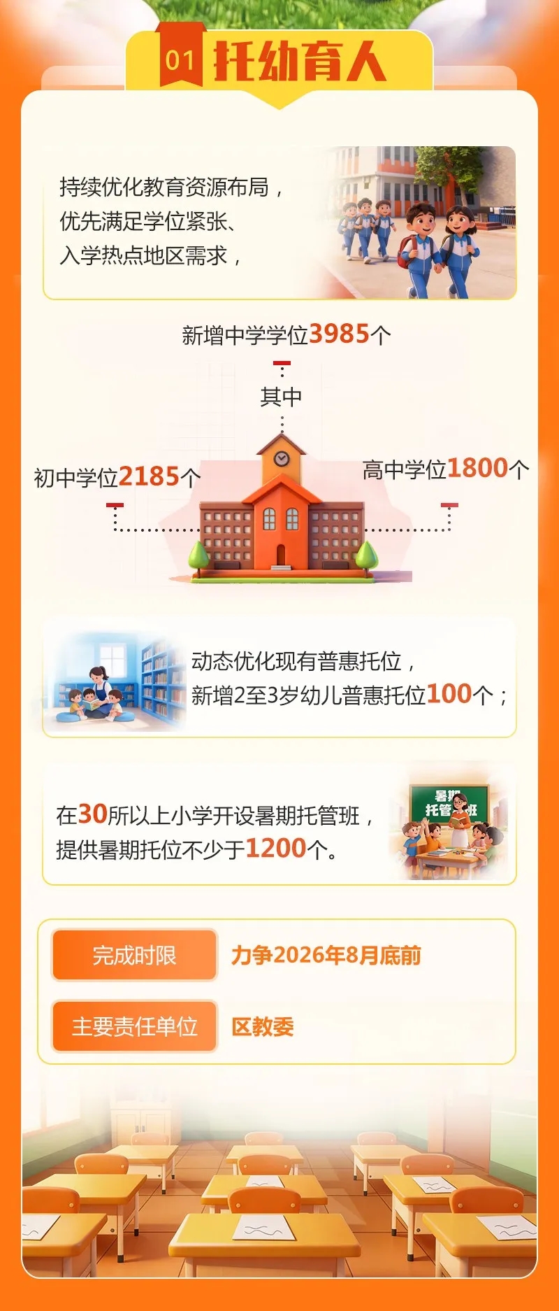 持续优化教育资源布局,优先满足学位紧张、入学热点地区需求,新增中学学位3985个,其中初中学位2185个、高中学位1800个;动态优化现有普惠托位,新增2至3岁幼儿普惠托位100个;在30所以上小学开设暑期托管班,提供暑期托位不少于1200个。