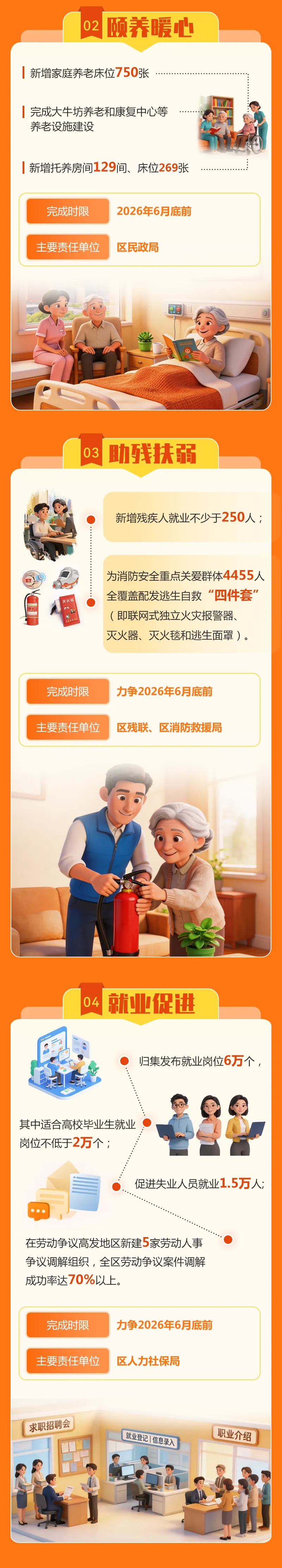 新增残疾人就业不少于250人;为消防安全重点关爱群体4455人全覆盖配发逃生自救“四件套”(即联网式独立火灾报警器、灭火器、灭火毯和逃生面罩)。