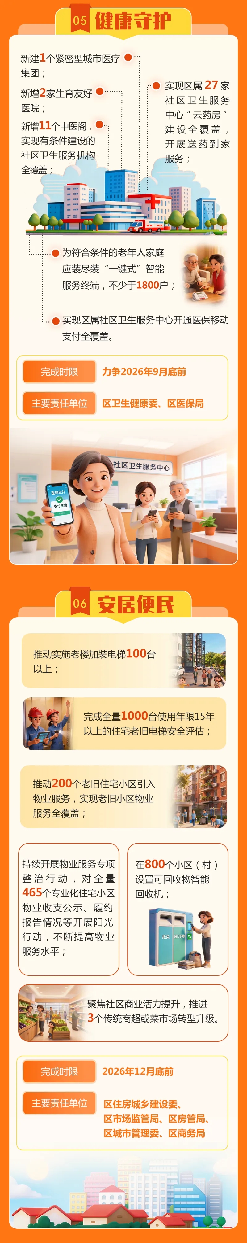 新建1个紧密型城市医疗集团;新增2家生育友好医院;新增11个中医阁,实现有条件建设的社区卫生服务机构全覆盖;实现区属27家社区卫生服务中心“云药房”建设全覆盖,开展送药到家服务;为符合条件的老年人家庭应装尽装“一键式”智能服务终端,不少于1800户;实现区属社区卫生服务中心开通医保移动支付全覆盖。