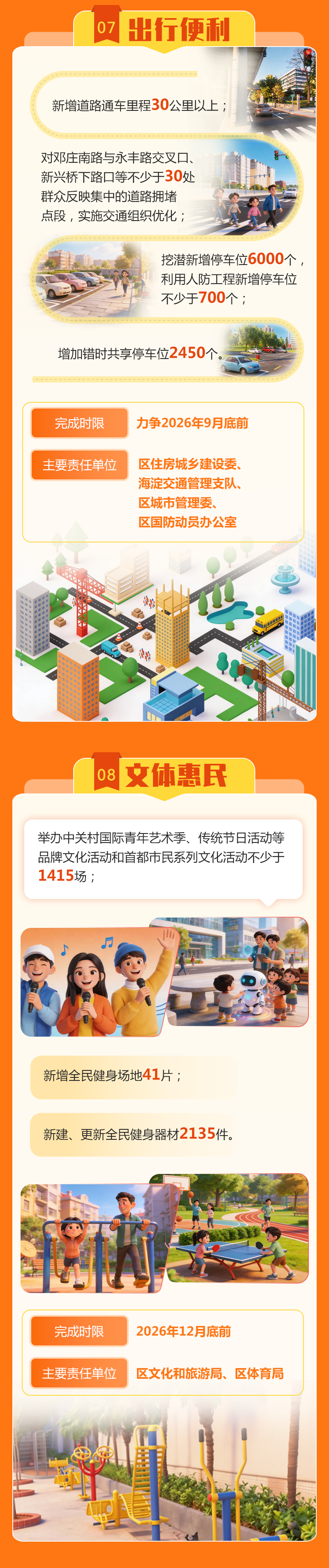 举办中关村国际青年艺术季、传统节日活动等品牌文化活动和首都市民系列文化活动不少于1415场;新增全民健身场地41片;新建、更新全民健身器材2135件。