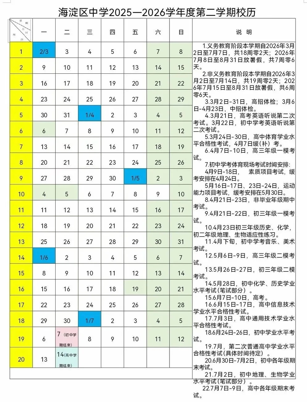 因北京各区目前暂未统一发布考试日历,以海淀区中学校历参考: