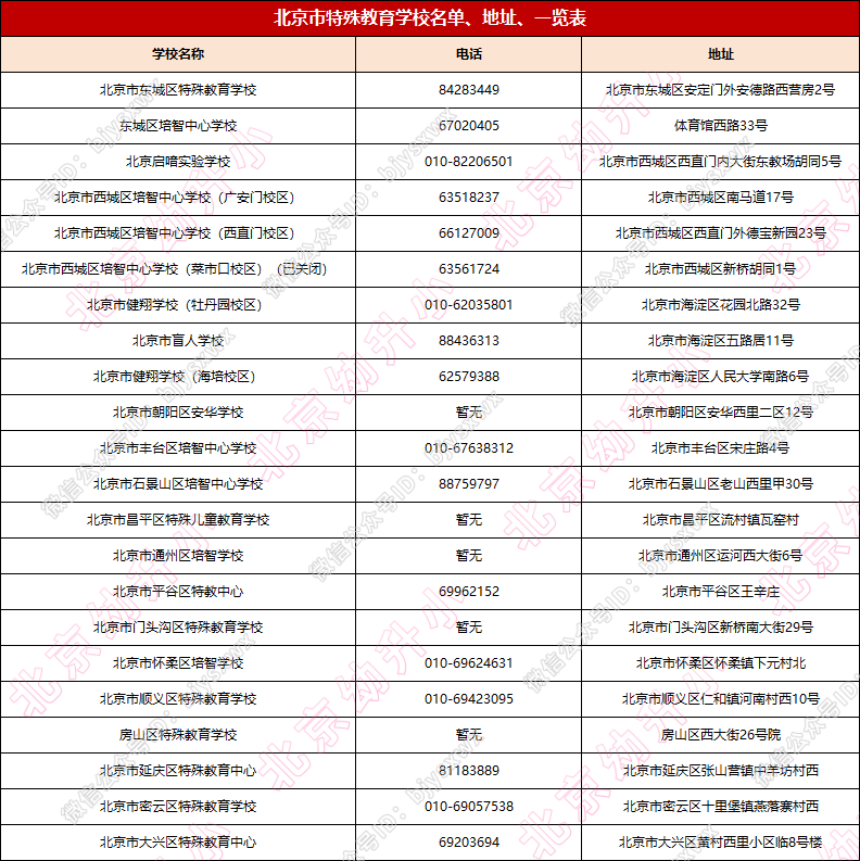 根据北京市人民政策整理信息,北京市目前有21所特殊学校(另含一所已关闭学校),详细方式、地址: