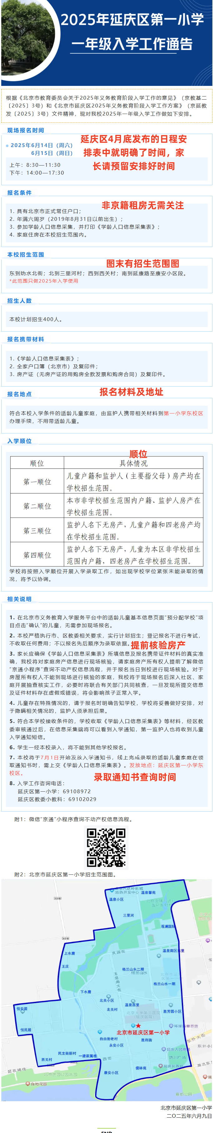 延庆区小学报名以线下报名为主,且小学招生简章中有诸多重点关键信息,以2025年延庆区第一小学招生简章为例: