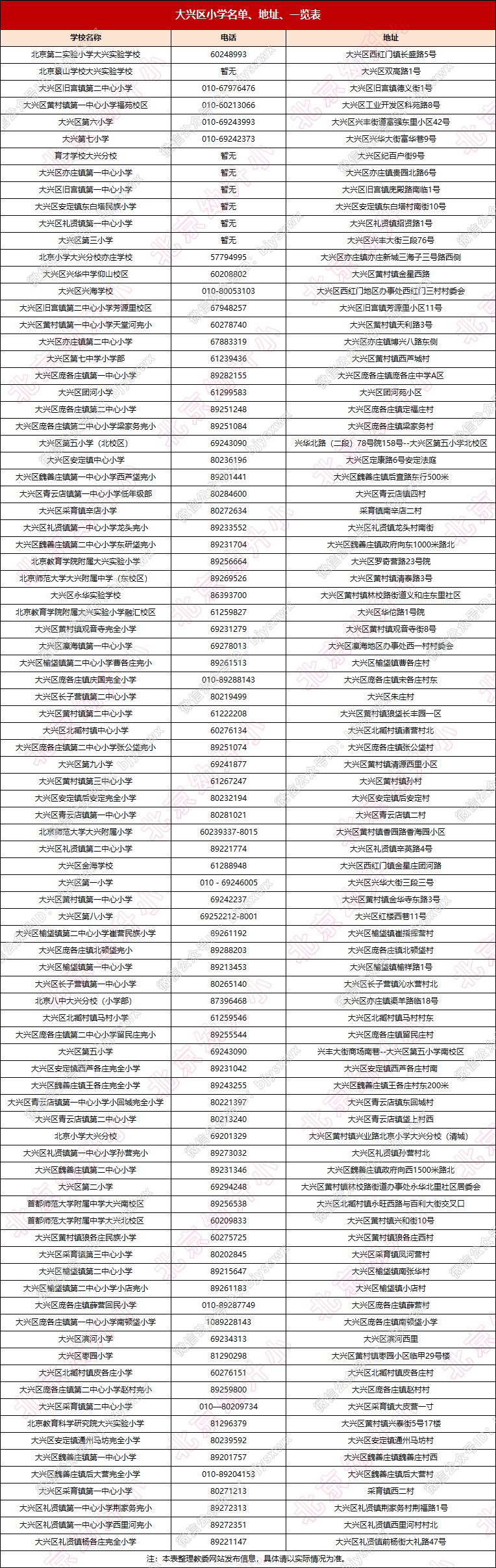 截至目前,大兴区总计89所小学,详细名单、地址、联系方式请点击查看大图: