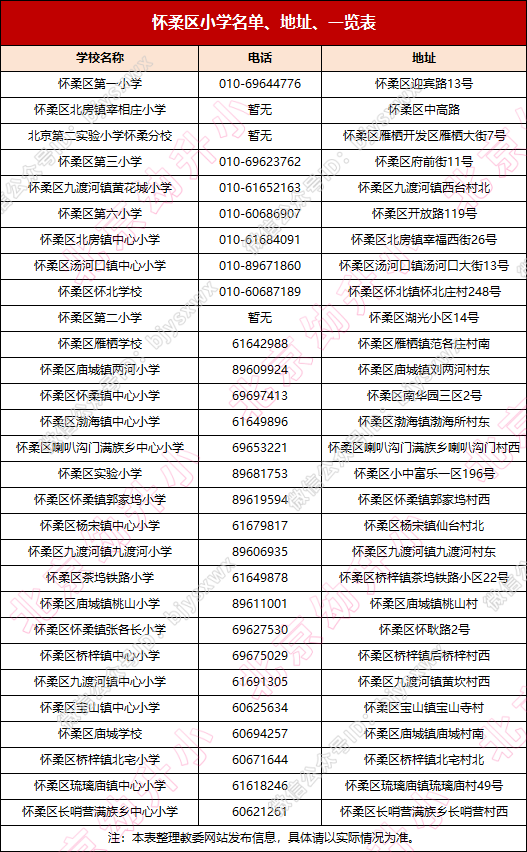 截至目前,怀柔区总计29所小学,详细名单、地址、联系方式请点击查看大图: