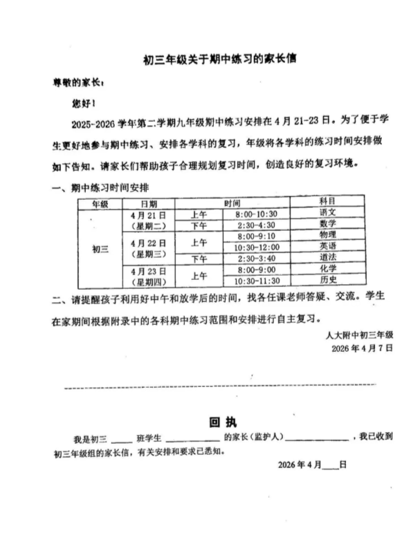 海淀区人大附中2026年初三年级期中考试时间安排已公布,涵盖各科目考试日期时间安排,本文为家长分享期中考试相关信息,同时本文末有往前期中期末考真题,供家长参考备考。