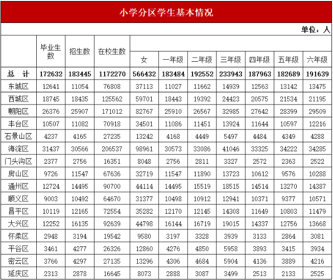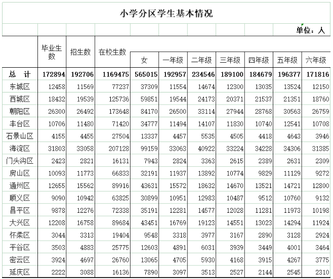 幼升小人数回落,同时学位压力呈现出向初中阶段传导的态势,并根据此前北京市教委发布的北京2025-2026学年度小学教育统计全览:分区校、生、师数据大公开来看,北京市各区小学毕业生(现六年级)人数:
